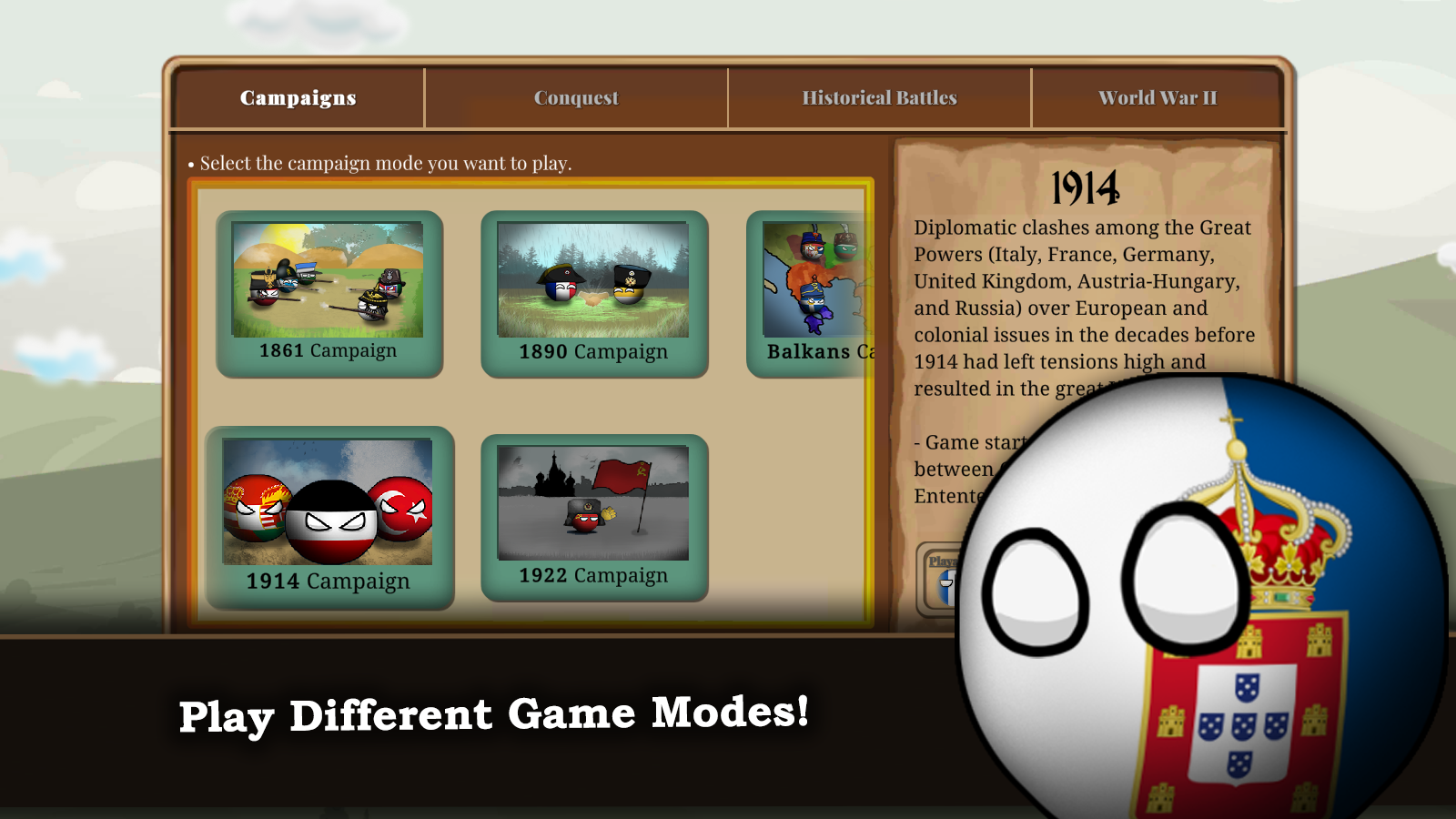 Countryball: Europe 1890 takes you through significant historical campaigns across the 19th and 20th centuries—with a humorous twist using quirky countryball characters. The game presents an entertaining yet insightful exploration of European warfare, tracing back to events like the tumultuous 1914 conflict involving the great powers of Italy, France, Germany, England, Austria, and Russia.