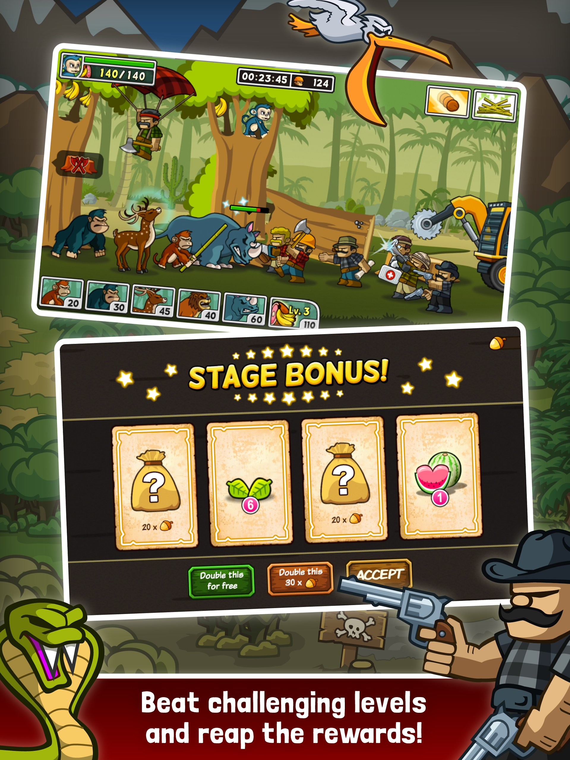 Channel your inner Tarzan with Koko, swinging through the jungle and engaging in fierce battles against lumberjacks and rangers!