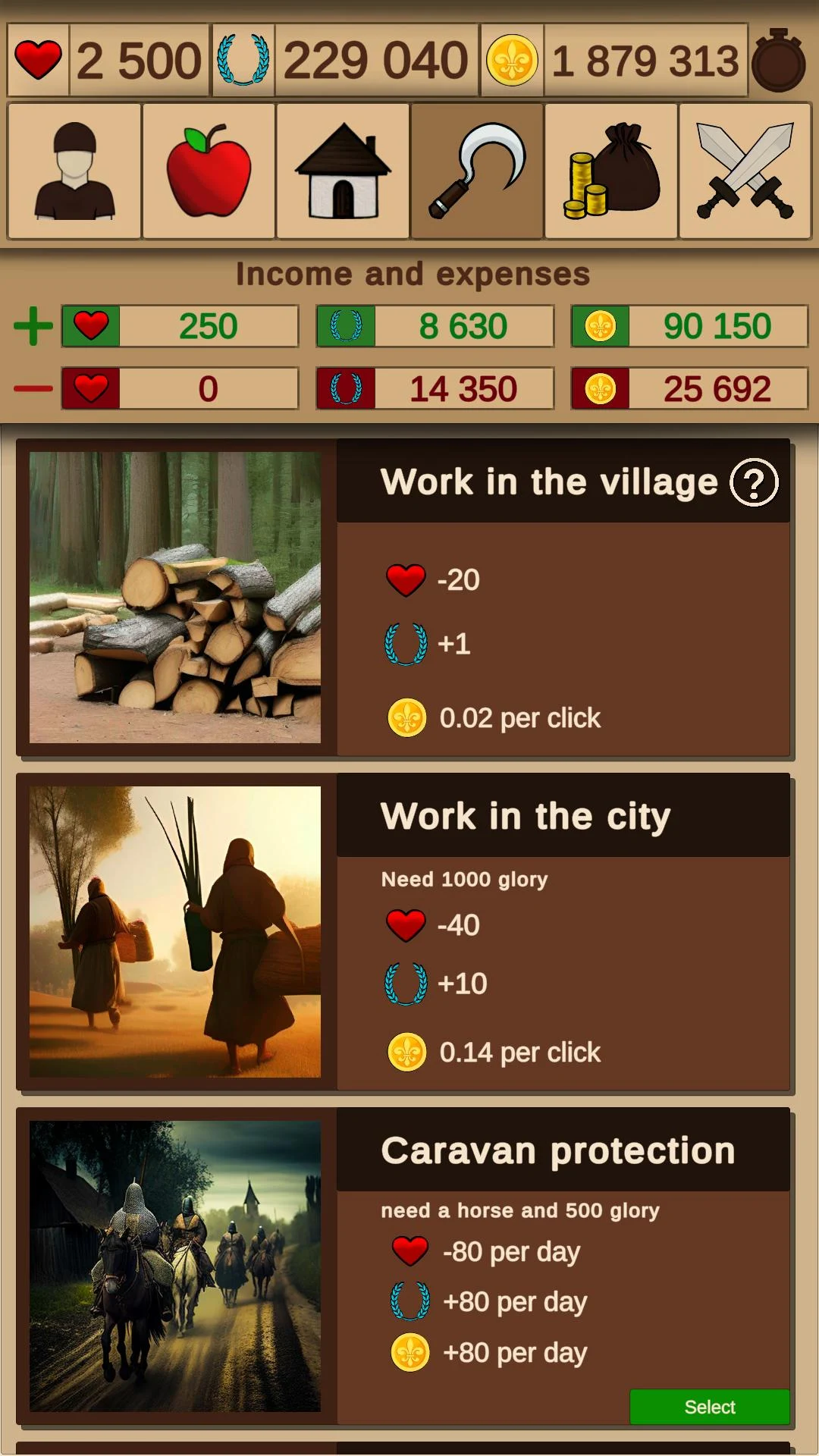 As your group transforms from a band of misfits into a formidable army, opportunities will arise. You can either conduct raids under your lord's banners or venture out on glorious quests for treasure. The strength of your military lies in the funds and charisma you accumulate through working and savvy deals.